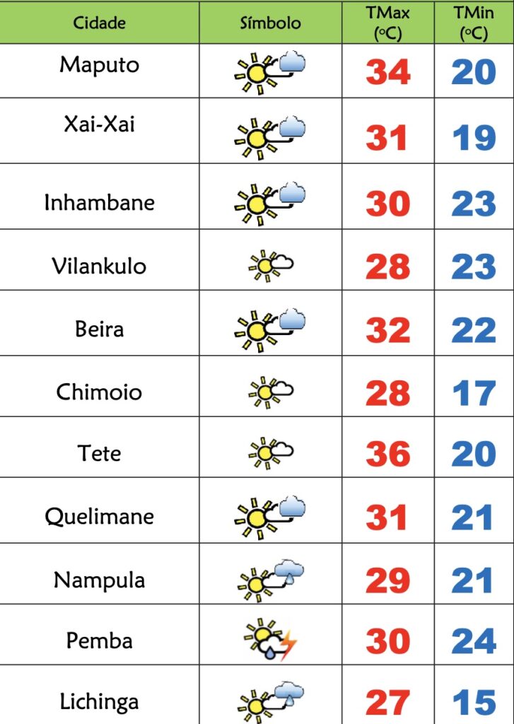 O Instituto Nacional de Meteorologia(INAM) prevê o seguinte estado do tempo para esta segunda-feira(06) em Moçambique: nas províncias de Niassa, Cabo Delgado e Nampula céu pouco nublado, temporariamente muito nublado, chuvas fracas locais e neblinas matinais, principalmente nos vales; Vento de sueste a leste fraco a moderado.
