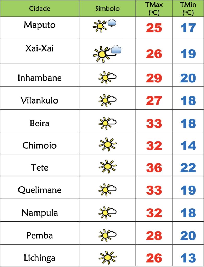 Nas províncias de Inhambane, Gaza e Maputo o INAM prevê céu pouco nublado, com períodos de muito nublado na província e cidade de Maputo; Possibilidades de chuviscos locais; Vento de nordeste fraco a moderado, rodando sueste, soprando por vezes com rajadas.