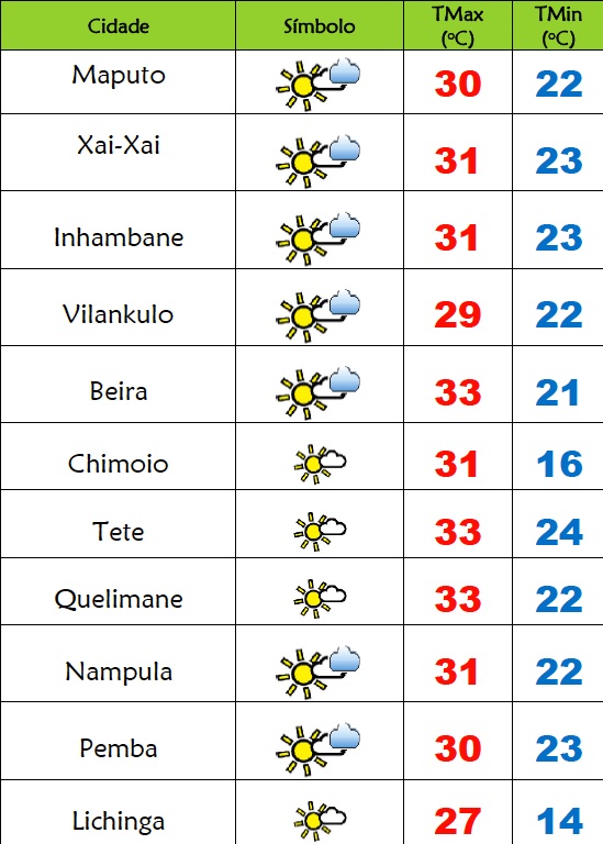 O Instituto Nacional de Meteorologia(INAM) prevê o seguinte estado do tempo para este quarta-feira(21), 1119 dia em Emergência de Saúde Pública em Moçambique: nas províncias de Niassa, Cabo Delgado e Nampula céu pouco nublado localmente muito nublado, e possibilidade de chuvas fracas ou chuviscos locais; Neblinas e nevoeiros locais, principalmente ao longo dos vales; Vento de nordeste a sudoeste, geralmente fraco.