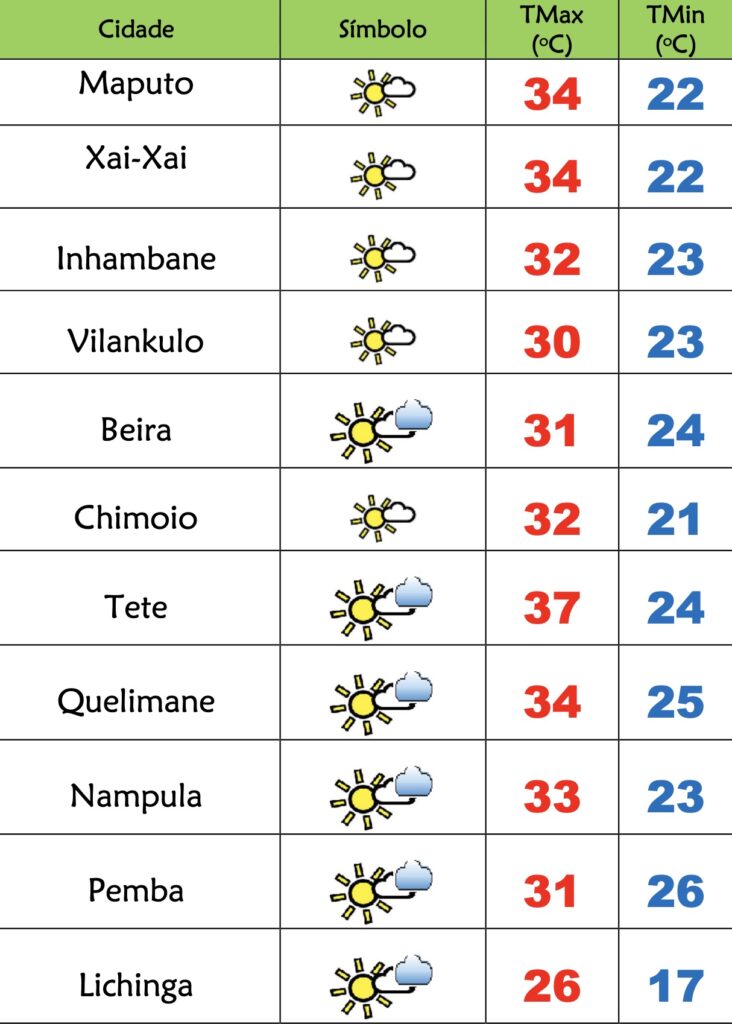 O Instituto Nacional de Meteorologia(INAM) prevê o seguinte estado do tempo para esta quinta-feira(27), 1298 dia em Emergência de Saúde Pública em Moçambique: nas províncias de Niassa, Cabo Delgado e Nampula céu pouco nublado localmente muito nublado; Possibilidade de chuvas fracas locais; Vento de nordeste a sueste fraco a moderado.