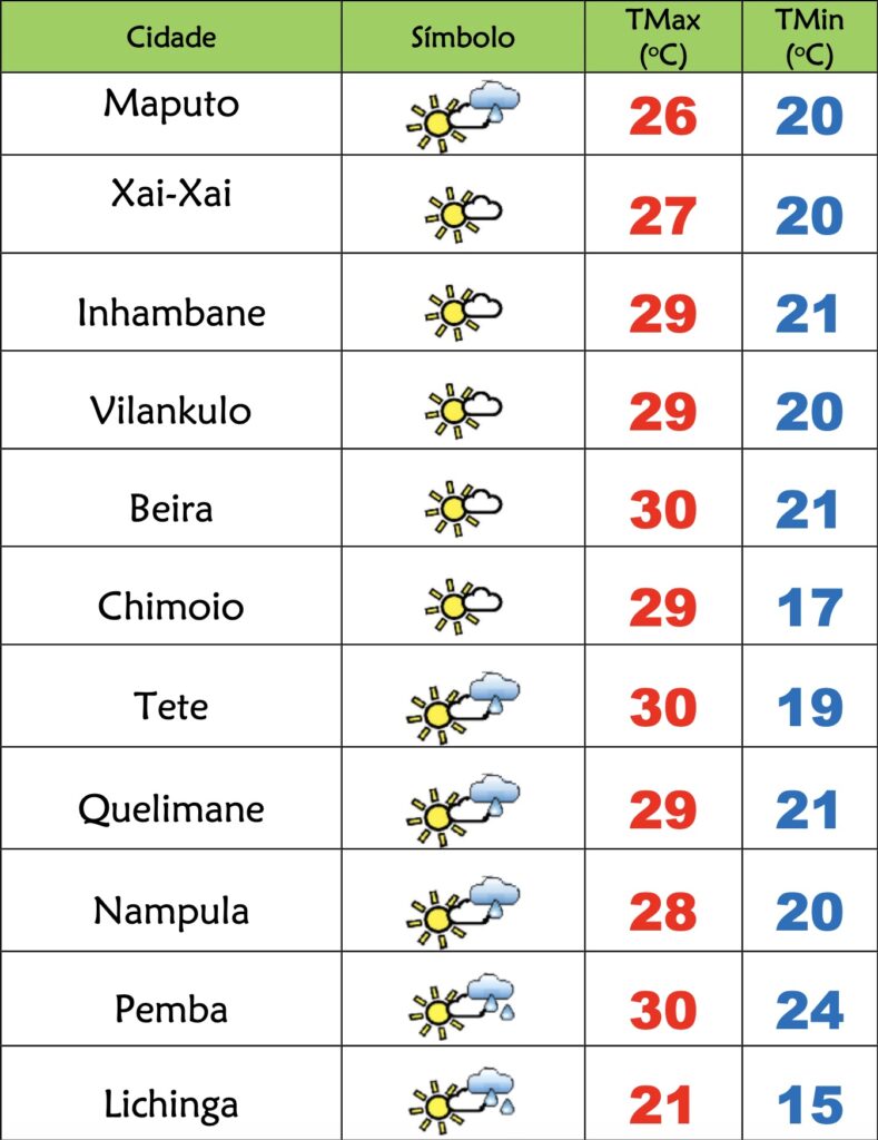Nas províncias de Inhambane, Gaza e Maputo o INAM prevê céu pouco nublado; Possibilidade de chuvisco ou chuva fraca na província e cidade de Maputo; Vento de sueste a nordeste fraco a moderado.
