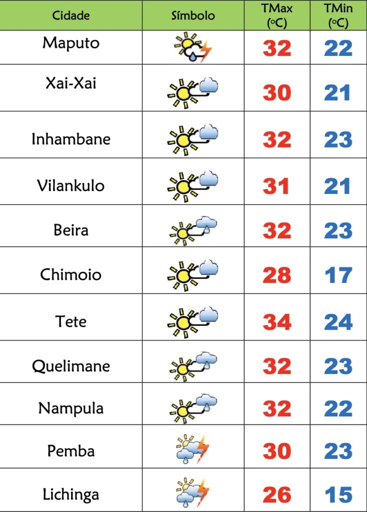 Nas províncias de Inhambane, Gaza e Maputo o INAM prevê céu pouco nublado com períodos de muito nublado, possibilidade de chuvas fracas com trovoadas no extremo sul da província de Maputo; Neblinas ou nevoeiro matinal local com vento de sueste a nordeste fraco a moderado.