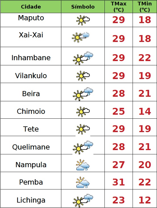 Nas províncias de Inhambane, Gaza e Maputo o INAM prevê céu pouco nublado localmente nublado; Possibilidades de chuviscos ou chuvas fracas ao longo da zona costeira das provincias de Gaza e Inhambane; Neblinas ou nevoeiros matinais em Maputo, Gaza e sul de inhambane; Vento de sueste a nordeste fraco a moderado.