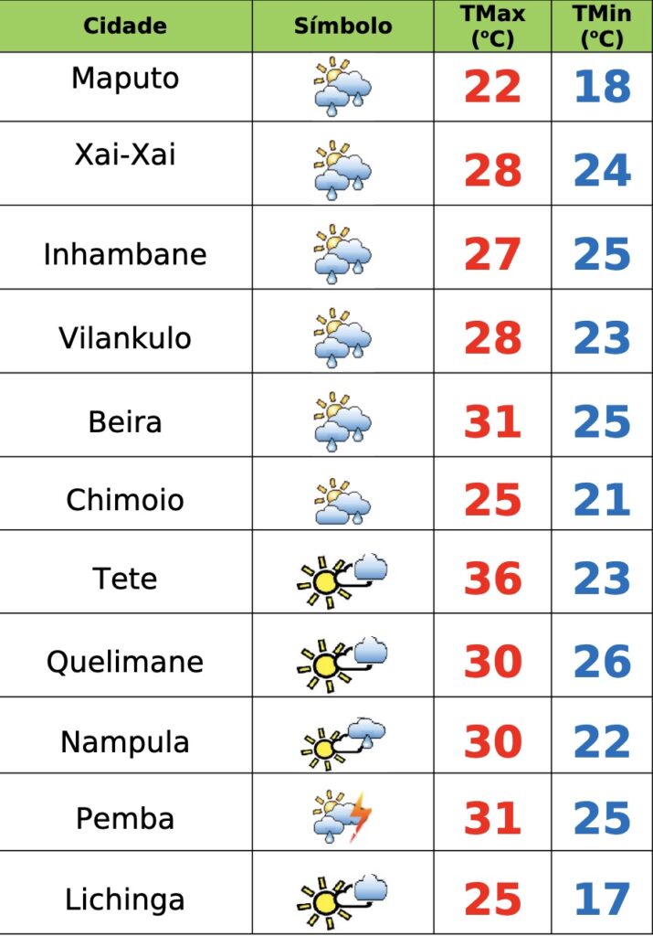 O Instituto Nacional de Meteorologia(INAM) prevê o seguinte estado do tempo para esta quinta-feira(23) em Moçambique: nas províncias de Niassa, Cabo Delgado e Nampula céu pouco nublado localmente nublado, possibilidade de chuvas fracas ao longo dos distritos costeiro. Nevoeiros ou neblinas matinais a sul de Nampula e Niassa com vento de sueste a leste predominantemente fraco.