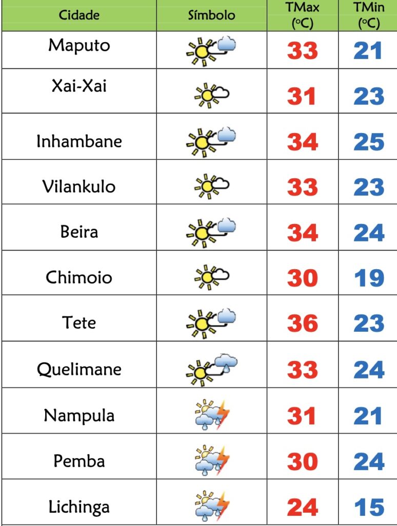 Para as províncias de Tete, Zambézia, Manica e Sofala está previsto céu pouco nublado localmente muito nublado, possibilidade de chuvas fracas locais; Vento de sueste a sudoeste fraco a moderado.