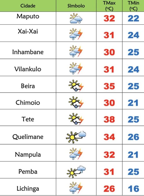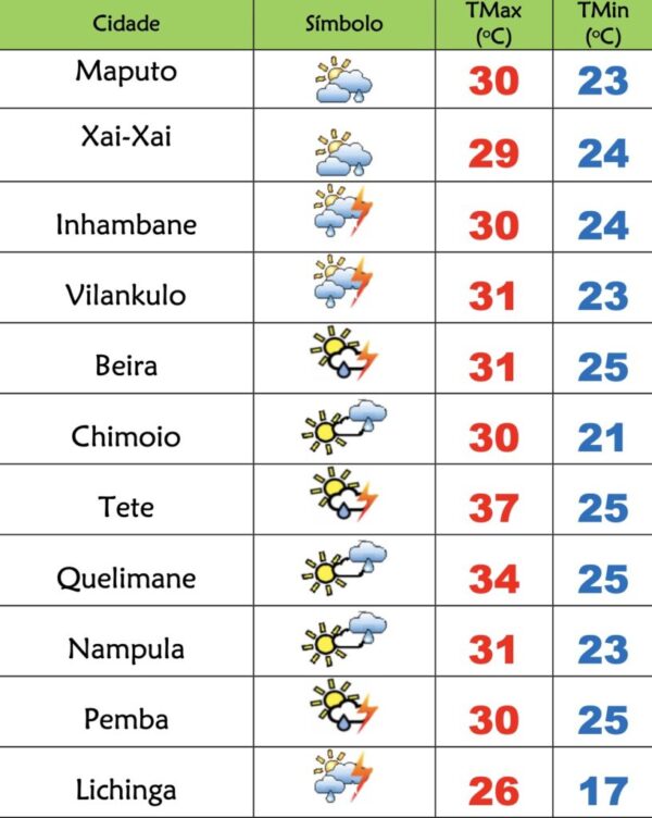 O Instituto Nacional de Meteorologia(INAM) prevê o seguinte estado do tempo para este sábado(07) em Moçambique: nas províncias de Niassa, Cabo Delgado e...