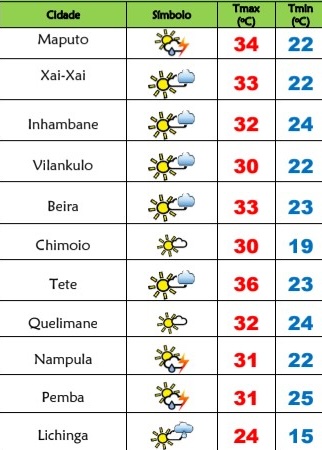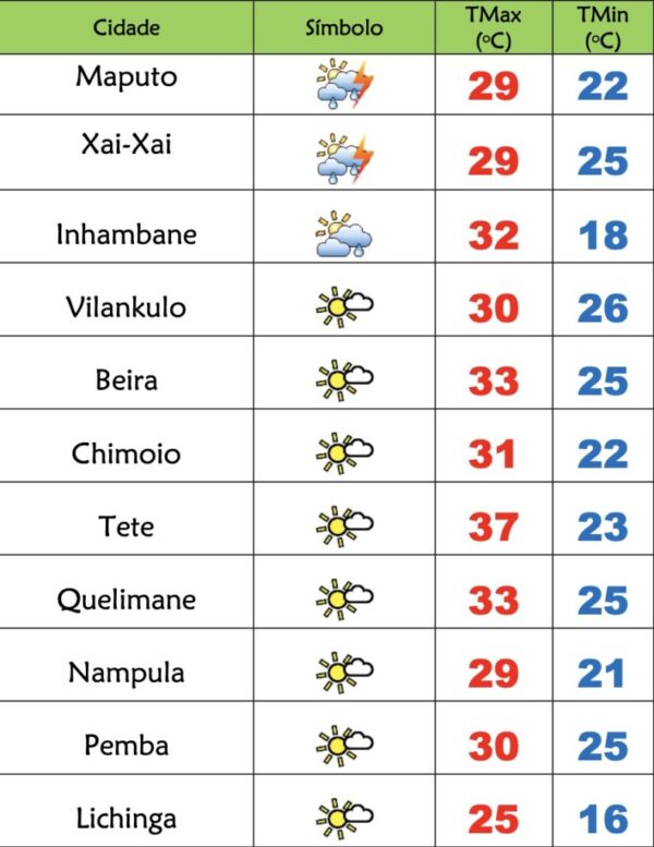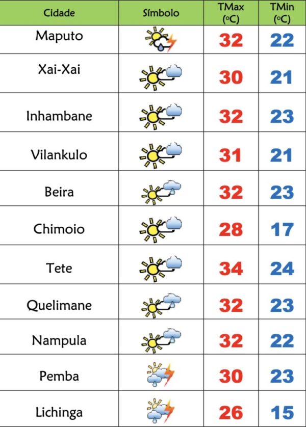O Instituto Nacional de Meteorologia(INAM) prevê o seguinte estado do tempo para esta quinta-feira(23) em Moçambique: nas províncias de Niassa, Cabo Delgado e...