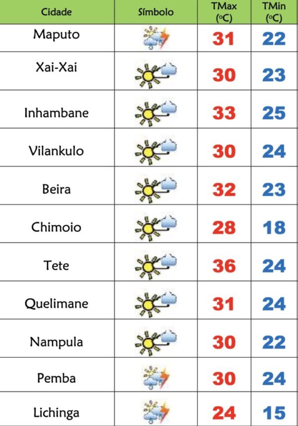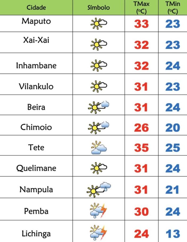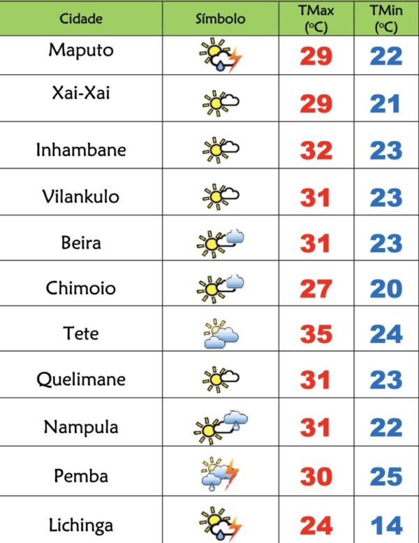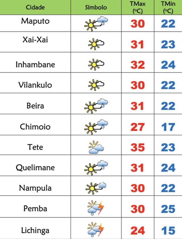Byfalabweabril 11, 2026O Instituto Nacional de Meteorologia(INAM) prevê o seguinte estado do tempo para este domingo(12) em Moçambique: nas províncias de Niassa, Cabo Delgado e...