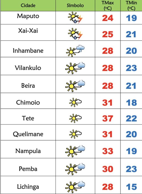 Byfalabweoutubro 18, 2025O Instituto Nacional de Meteorologia(INAM) prevê o seguinte estado do tempo para este sábado(18), 1259 dia em Emergência de Saúde Pública em Moçambique:...