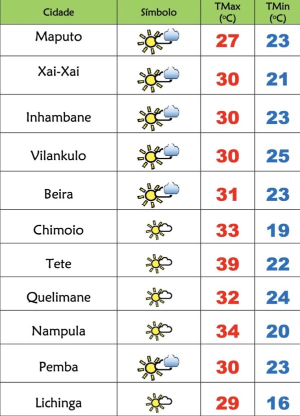Byfalabweoutubro 12, 2025O Instituto Nacional de Meteorologia(INAM) prevê o seguinte estado do tempo para este domingo(12), 1253 dia em Emergência de Saúde Pública em Moçambique:...