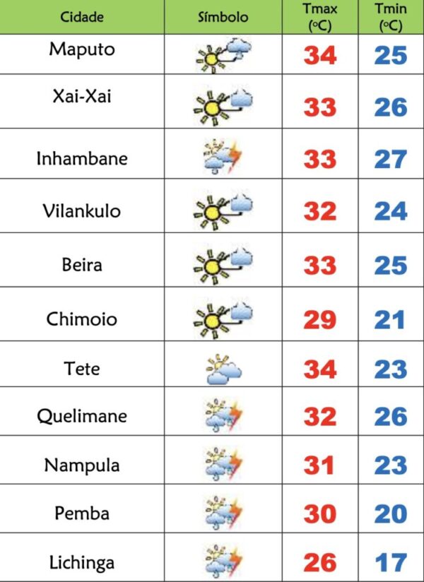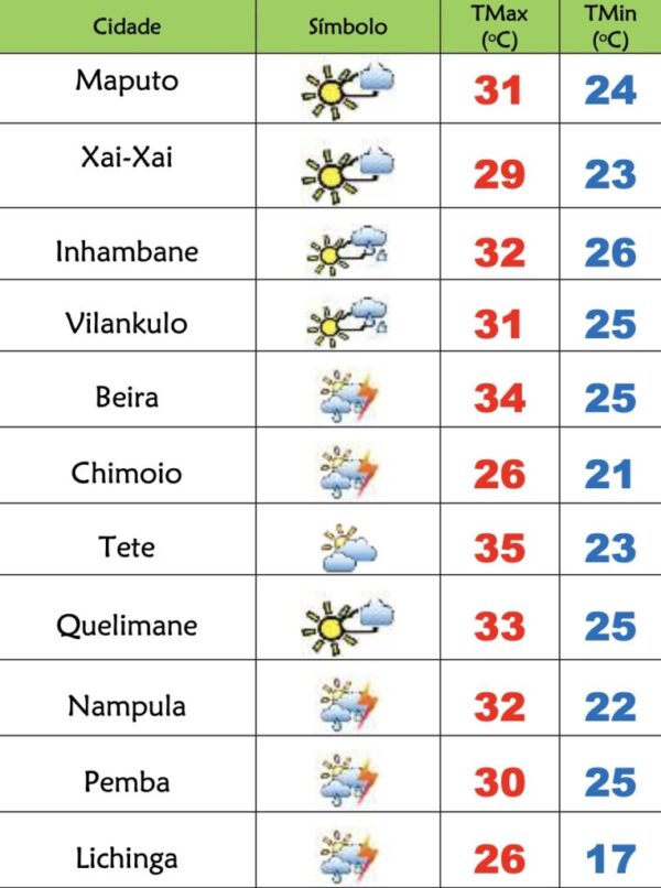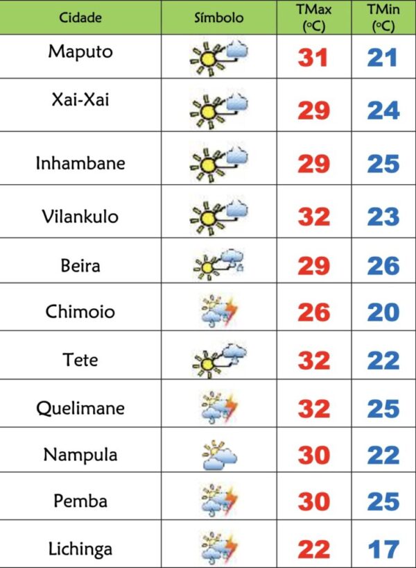 Byfalabwemarço 30, 2026O Instituto Nacional de Meteorologia(INAM) prevê o seguinte estado do tempo para esta segunda-feira(30) em Moçambique: nas províncias de Niassa, Cabo Delgado e...