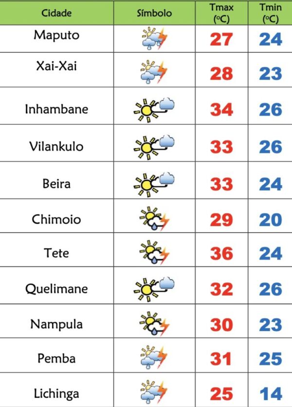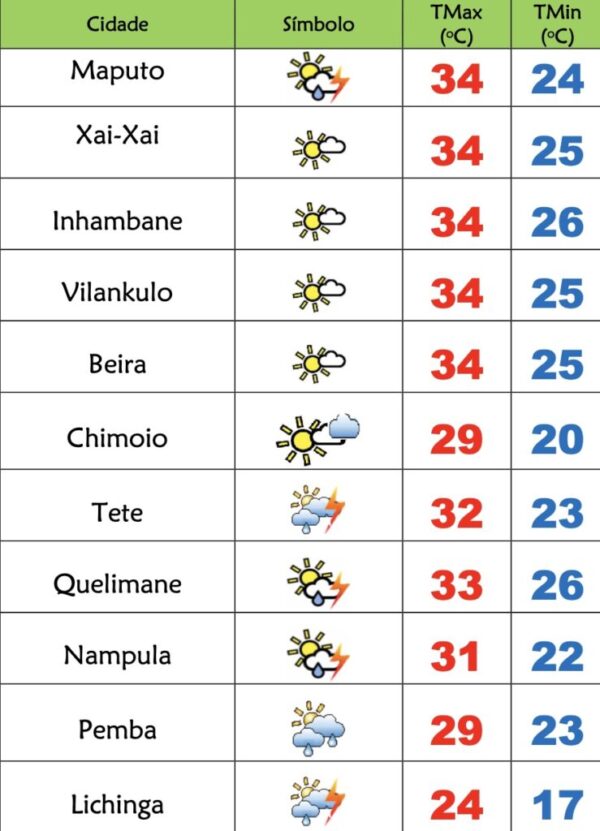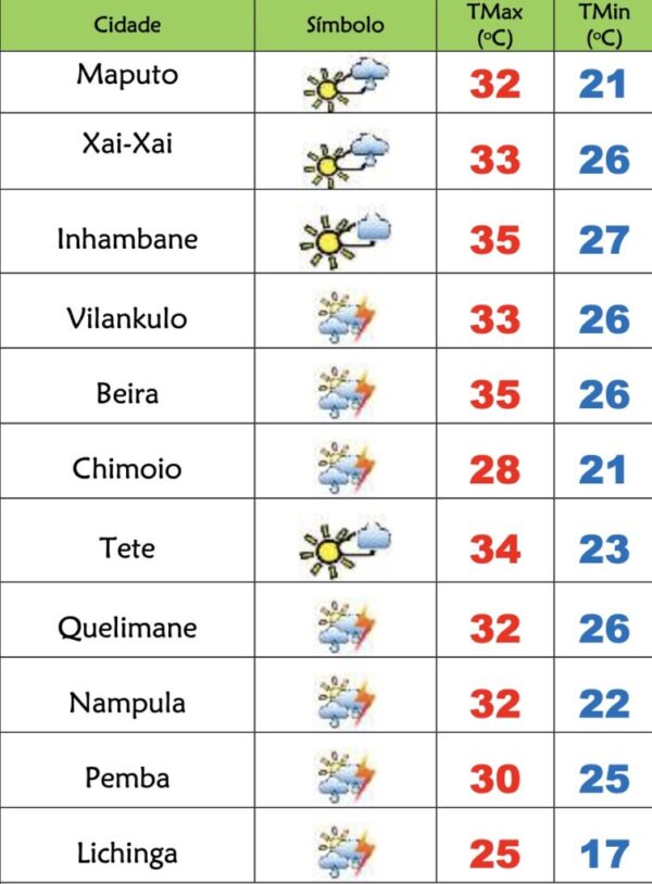 Byfalabwemarço 22, 2026O Instituto Nacional de Meteorologia(INAM) o seguinte estado do tempo para este domingo(22) em Moçambique: nas províncias de Niassa, Cabo Delgado e Nampula...