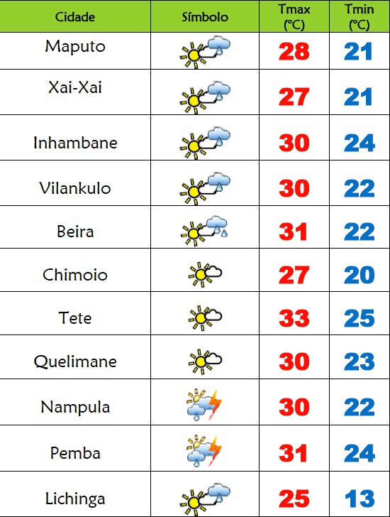 Byfalabweabril 26, 2025O Instituto Nacional de Meteorologia(INAM) prevê o seguinte estado do tempo para este sábado(26), 1095 dia em Emergência de Saúde Pública em Moçambique:...