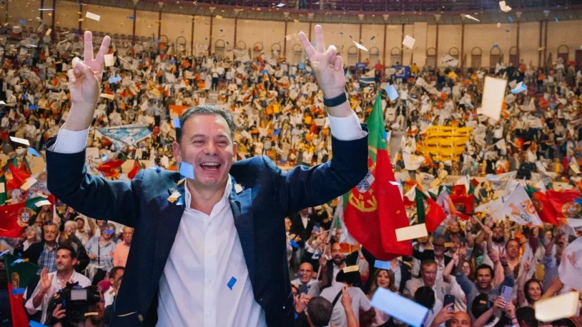 O 2º lugar segue indefinido, mas, por ora, o PS, de centro-esquerda, liderado por Pedro Nuno Santos, e o Chega, de direita, comandado por André Ventura, aparecem empatados com 58 vagas cada um.