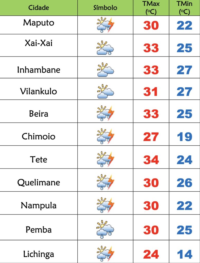 Nas províncias de Inhambane, Gaza e Maputo o INAM prevê céu pouco nublado localmente muito nublado; Chuvas locais que podem ser acompanhadas de trovoadas na província e cidade de Maputo; Vento de nordeste rodando para sueste fraco a moderado com rajadas.