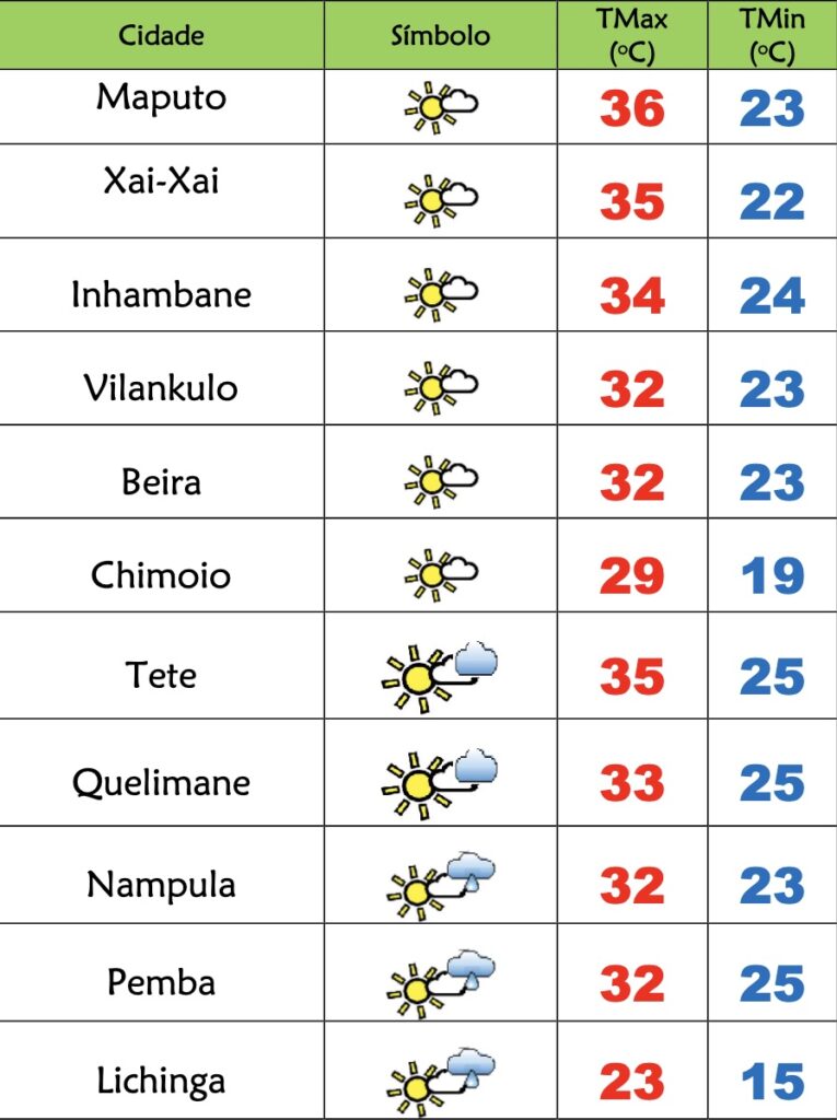 Nas províncias de Inhambane, Gaza e Maputo o INAM prevê tempo muito quente, com céu predominantemente limpo; Vento de nordeste a noroeste fraco.