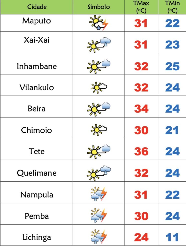 Nas províncias de Inhambane, Gaza e Maputo o INAM prevê céu pouco nublado, com períodos de muito nublado, possibilidade de chuvas fracas locais no extremo sul. Vento de sueste a leste fraco a moderado.