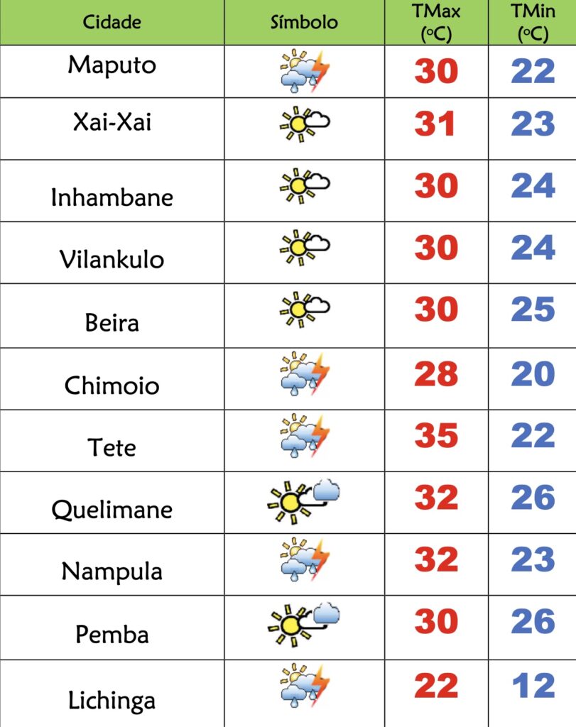 Eis as temperaturas previstas para este domingo(07), 1308 dia em Emergência de Saúde Pública em Moçambique: