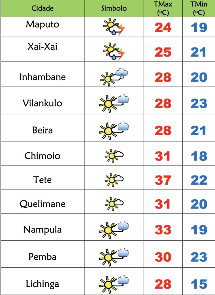 Nas províncias de Inhambane, Gaza e Maputo o INAM prevê céu pouco nublado temporariamente muito nublado; Possibilidade de trovoadas e chuvas fracas locais; Vento de nordeste fraco a moderado, rodando sueste e soprando por vezes com rajadas.