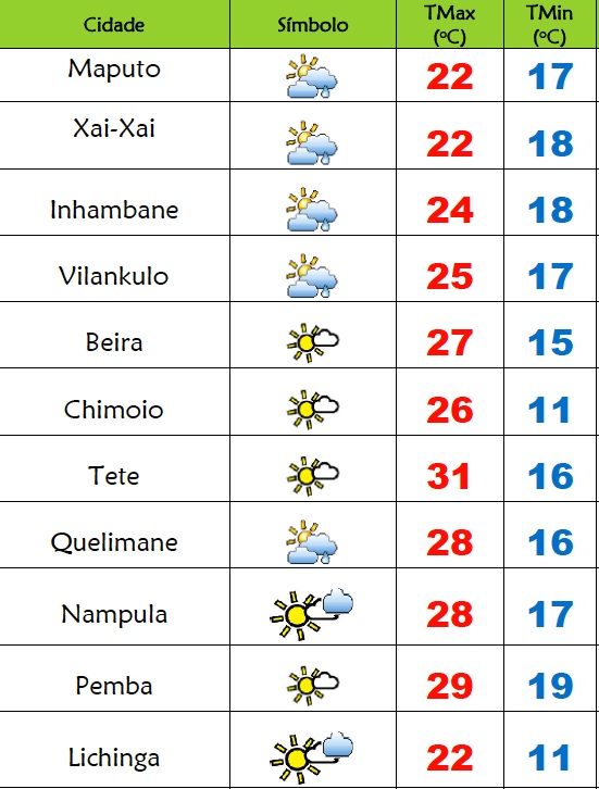 Nas províncias de Inhambane, Gaza e Maputo o INAM prevê céu pouco a nublado temporariamente; Possibilidades de chuvas locais; Vento de nordeste a leste fraco a moderado, rodando para sueste e soprando por vezes com rajadas.