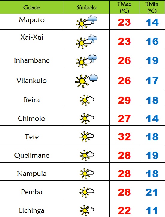 Nas províncias de Inhambane, Gaza e Maputo o INAM prevê céu pouco nublado, com períodos de muito nublado; Possibilidade de chuvas fracas ou chuviscos ao longo da costa; Vento de nordeste a noroeste fraco a moderado, rodando para sueste soprando por vezes com rajadas.