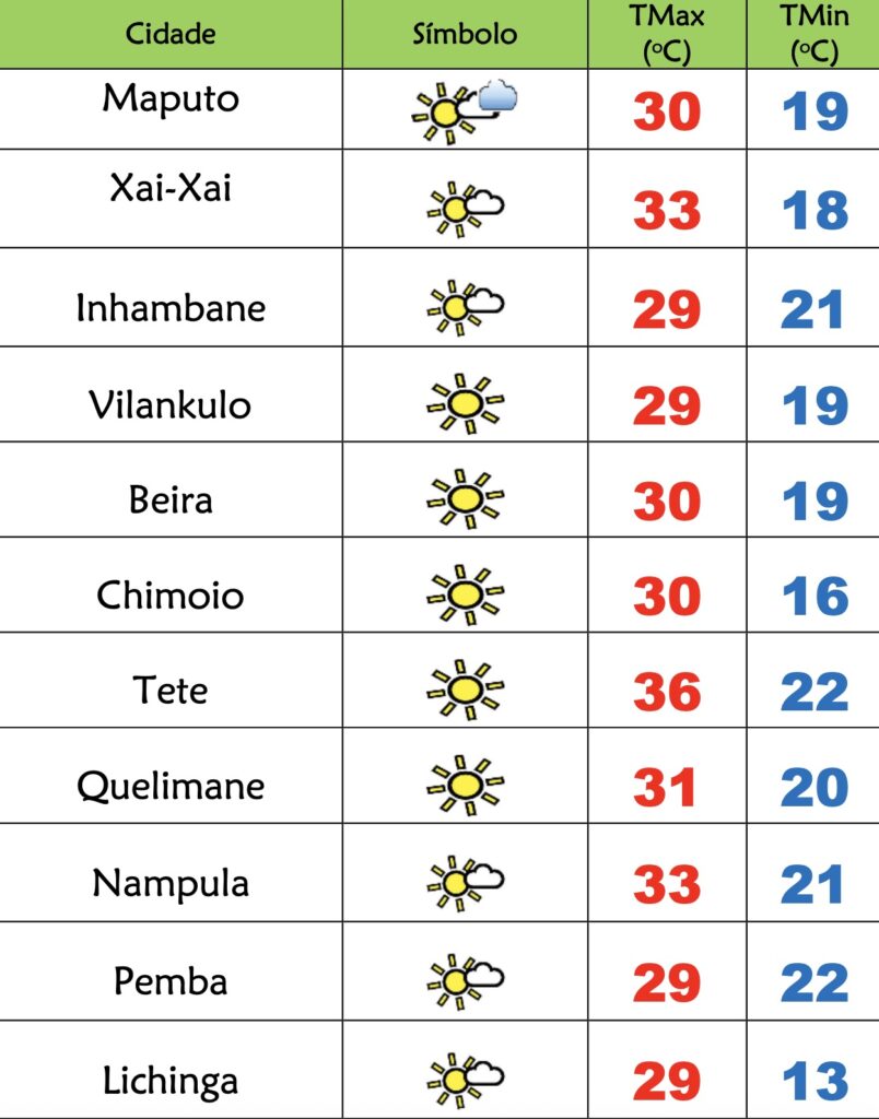 Para as províncias de Tete, Zambézia, Manica e Sofala está previsto céu pouco nublado a limpo; Ocorrências de nevoeiro ou neblinas matinais locais; Vento de nordeste a leste fraco a moderado.