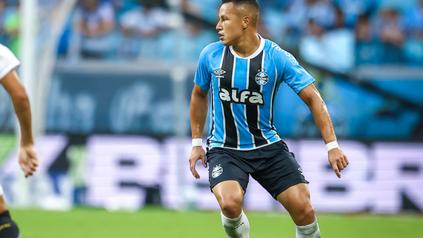 O Grêmio teve problemas com o logo da Alfa, patrocinadora máster, que descolou das camisas de 2 jogadores durante a vitória contra o Santos no domingo (4.mai.2025), pela Série A do Campeonato Brasileiro.