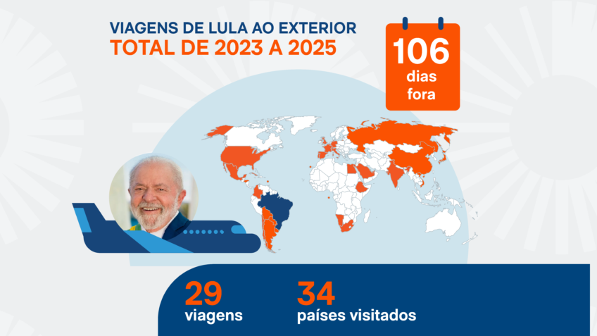 O presidente Luiz Inácio Lula da Silva (PT) passou 106 dias fora do Brasil durante o seu 3º mandato. Só em 2025 já foram 18 dias no exterior. O ano ainda está na metade do 5º mês, mas o petista já se aproxima da quantidade de 2024 –foram 26 dias naquele ano.