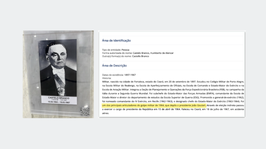 A pedido do presidente Luiz Inácio Lula da Silva (PT), o Palácio do Planalto passou a declarar na galeria de fotos de ex-presidentes que Humberto de Alencar Castelo Branco (1897-1967) foi um dos principais articuladores da ditadura militar de 1964.