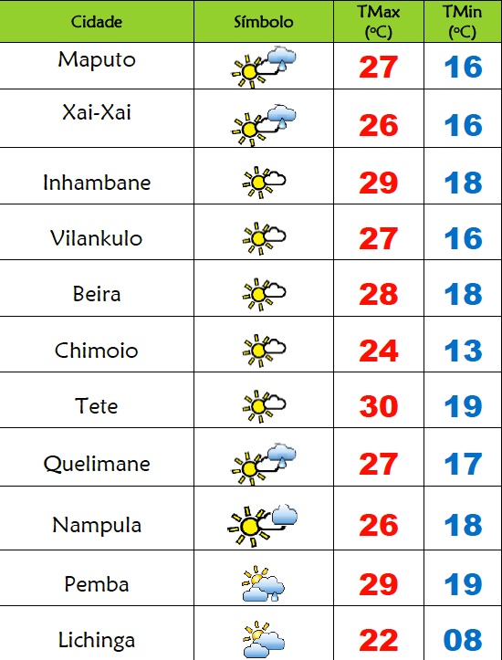 Para as províncias de Tete, Zambézia, Ma8nica e Sofala está previsto céu geralmente pouco nublado; Possibilidade de chuvas fracas principalmente na faixa costeira; Neblinas e nevoeiros matinais locais; Vento de sudoeste a sueste fraco a moderado.