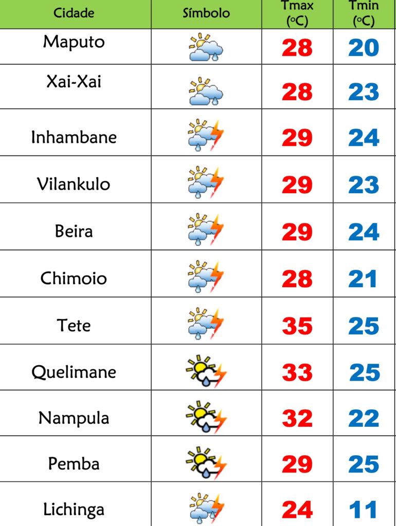 Para as províncias de Tete, Zambézia, Manica e Sofala está previsto céu pouco nublado localmente muito nublado; Chuvas fracas localmente moderadas a fortes acompanhadas de trovoadas; Vento de sueste a nordeste fraco a moderado, soprando por vezes com rajadas locais.