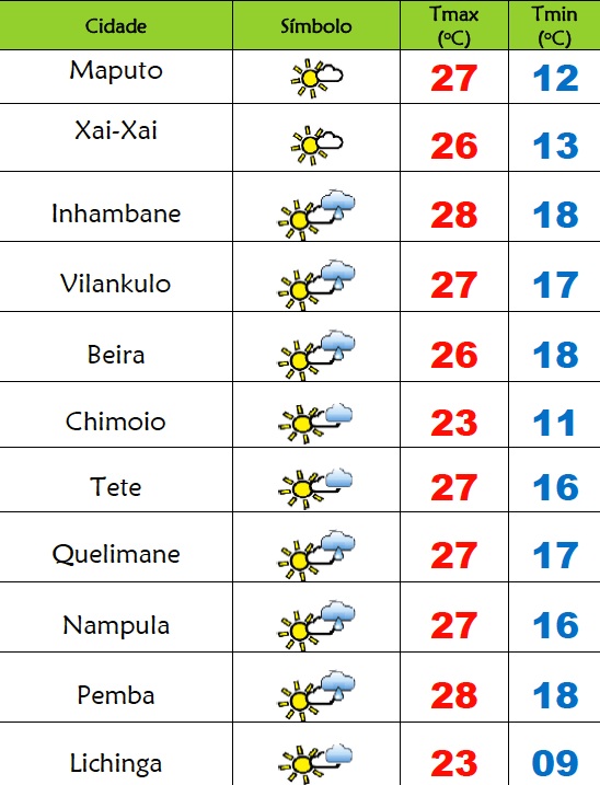 Para as províncias de Tete, Zambézia, Manica e Sofala está previsto céu pouco nublado temporariamente nublado; Possibilidade de chuvas fracas ao longo da faixa costeira; Ocorrências de neblinas ou nevoeiros locais; Vento de sueste a sudoeste fraco a moderado.