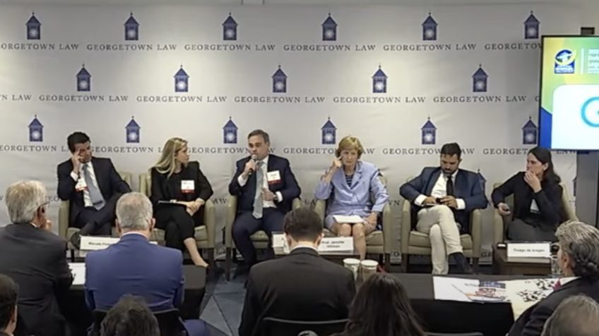 André Mendonça respondeu a uma pergunta de Don de Amicis, codiretor do Center on Transnational Business and the Law, da escola de direito da universidade Georgetown. O professor de Amicis perguntou sobre incertezas que os EUA experimentam neste momento e se havia similaridades com o que o Brasil passou na troca dos governos de Jair Bolsonaro (PL) para o de Luiz Inácio Lula da Silva (PT).