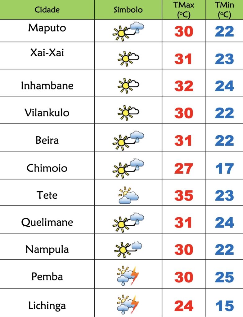 Para as províncias de Tete, Zambézia, Manica e Sofala está previsto céu pouco nublado localmente muito nublado, possibilidade de ocorrência de chuvas fracas locais com neblinas matinais locais; Vento de sueste a nordeste fraco a moderado.