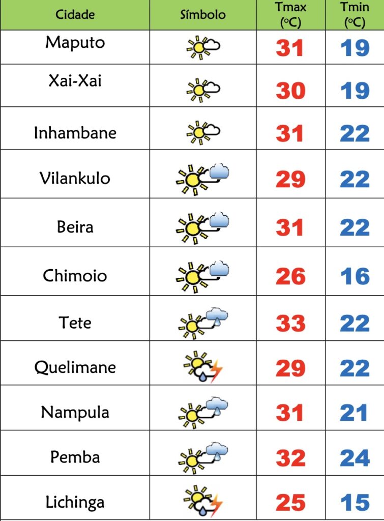 O Instituto Nacional de Meteorologia(INAM) prevê o seguinte estado do tempo para este sábado(11) em Moçambique: nas províncias de Niassa, Cabo Delgado e Nampula céu pouco nublado com período de muito nublado, ocorrência chuvas fracas locais; Vento de sueste a leste fraco a moderado.