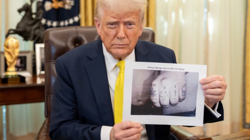 O presidente dos Estados Unidos, Donald Trump (republicano), usou seus perfis nas redes sociais nesta 6ª feira (18.abr.2025) para compartilhar uma foto da mão esquerda de Kilmar Abrego Garcia, deportado por engano para El Salvador, e dizer que ele integra a facção criminosa MS-13, a Mara Salvatrucha.